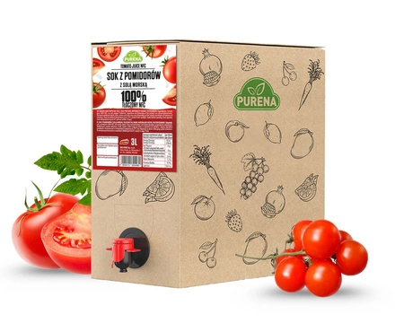 - Naturalny sok z gruntowych pomidorów 100%, bez dodatku cukru, z nutą soli morskiej. Tłoczony na zimno (NFC), pasteryzowany, gotowy do picia. Opakowanie 3L – idealne na co dzień i na specjalne okazje